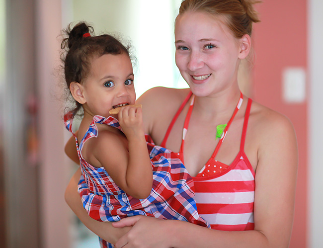 Katie, I am assuming that you are asking about the Victorian house when you ask if it is our house. Actually, it is our neighbor across the street. Our house is near the bottom of the page and is hard to see, but it is the one where all the kids and people are on the sidewalk and grass watching fireworks — our house is in the background. I use "older" and "younger" basically to separate our children that live at home from the ones that are gone — in college or out on their own. We have adopted 7 of our children. We don't really mention on our blog which children are adopted for their privacy. Some of our adopted children do not tell others that they are adopted at this time and I let that be their choice. I did mention that we adopted two girls with DS as I'm sure it was pretty obvious that we didn't give birth to 3 girls with DS. Caroline and Claire do not care at all and don't really understand the difference in "biological" and "adopted".
