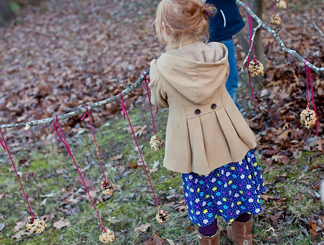 Then we went outside to hang everything in a tree — we chose a small one so they could reach the branches easily.