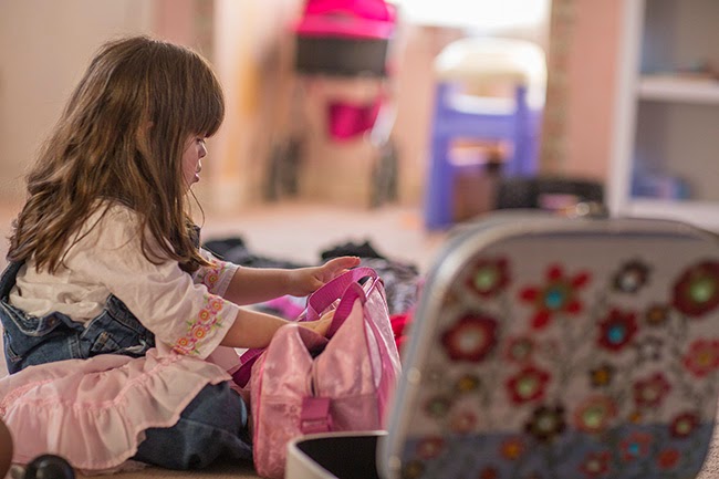 Bella can move through the house so quietly and entertain herself for such long periods of time that I find myself looking for her often. She loves to go up to Sarah, Caroline, and Bethany’s room, close the door, and get into their stuff — dolls, doll clothes, dress-up, and lots of little suitcases full of small dolls, animals, and tiny toys. She is so content.