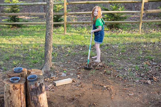 Early yesterday evening after the kids had gone in to eat a snack and get baths I went out to take a look and see how the kitchen was coming along. There really wasn’t much new, but they had done some work — cleaning and clearing, the clothes line, the garden and just a few other little things. I took my camera to take a few pictures. Bethany came running out to tell me that Piper and Bella had been in it and made it a mess and she started cleaning it up. I think she enjoyed the cleaning and raking and talking to me as I took pictures. She hung her dish towels and got everything straight for the next day.
