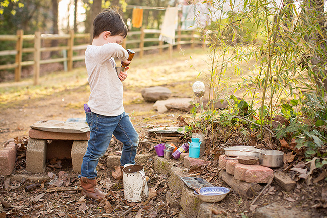 I was watching my grandson, Liam, in the outdoor kitchen late one afternoon, and he was so enthralled in his work of cleaning and cooking he hardly noticed I was there. It amazes me how much all the kids love this outdoor kitchen and it cost so little and is mainly dirt and a few spoons and plates and cups. Kids can be so happy using their imaginations and making their own little play spaces.