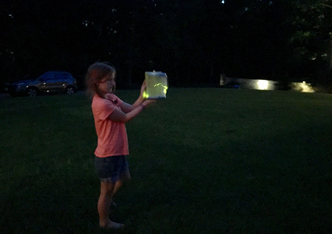 She just uses a mason jar or her bug catcher and watches for them to light up. Then she catches them with hands and puts them in the container but only keeps them a short time. We always let them go.