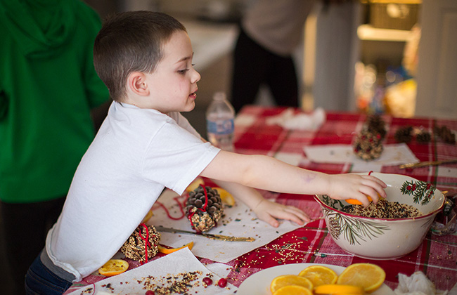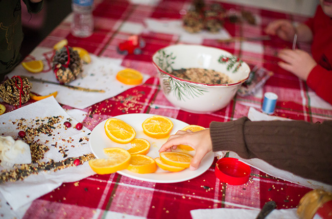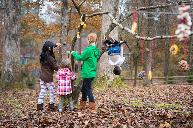 Today our special thing was to make a Christmas tree for the birds and squirrels. We have done this before and the kids always enjoy doing it. We got popcorn, peanut butter, cranberries, oranges and bird seed and the kids made a bunch of stuff to hang on a tree out back. It was a big success and a huge mess. Our floor was covered with bird seed and berries and popcorn. They actually worked on this for well over an hour and everyone had a lot of fun. Then we took everything outside and hung it all on a tree.