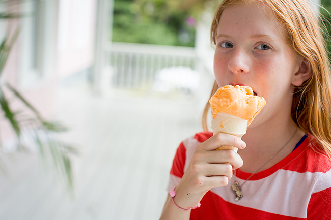 I think the beautiful colors of sherbet are just so summery. I think of summer whenever it is mentioned. Maybe because my grandmother would buy it when I was there for the summer and we would sit outside on summer evenings and eat it. My kids love it, I think, just because of the colors. We bought it for the first time this summer and it was enjoyed by everyone – except Sarah. She almost never eats any ice cream that is not chocolate or vanilla. No convincing her it is good.