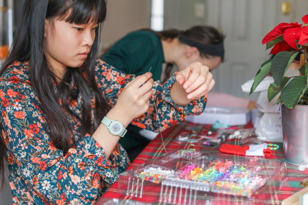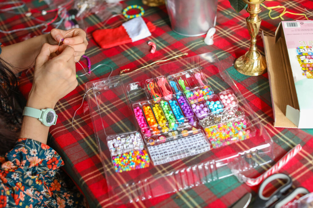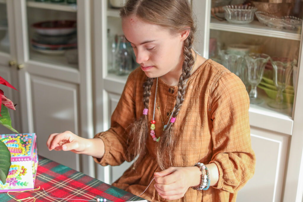 Today we did several things. We had planned for our “special thing” to be going to the school up the street and looking at all the Christmas lights they decorated with – and we did do that. The girls also made bracelets with the jewelry making kit they got today at church from their Sunday school teacher. They barely made it in the door and they were opening the boxes and making bracelets. They did make some pretty ones.